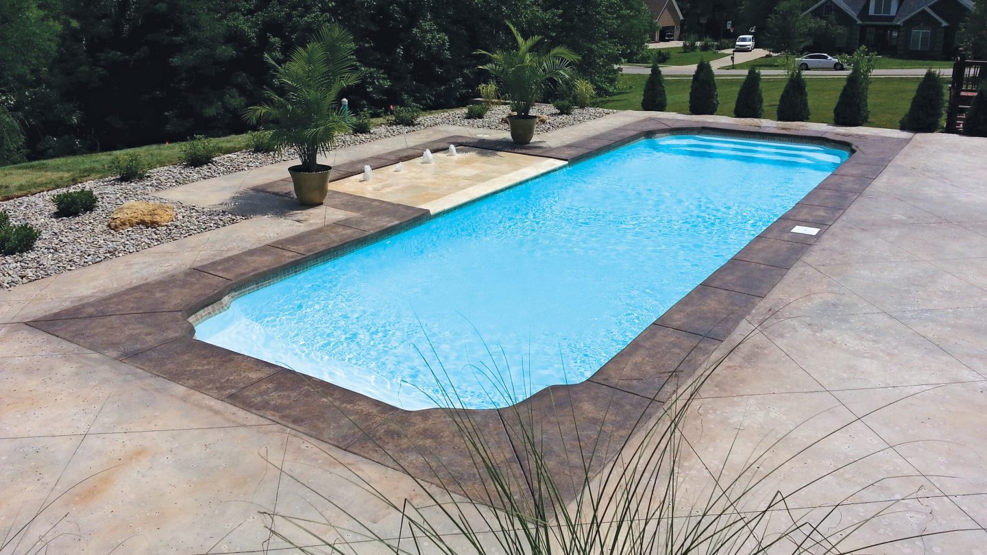 The Cancun pool model. Dimensions: 14′ x 40′. Depth: 3′ to 5′ to 3′. High-quality fiberglass pool perfect for your outdoor space.