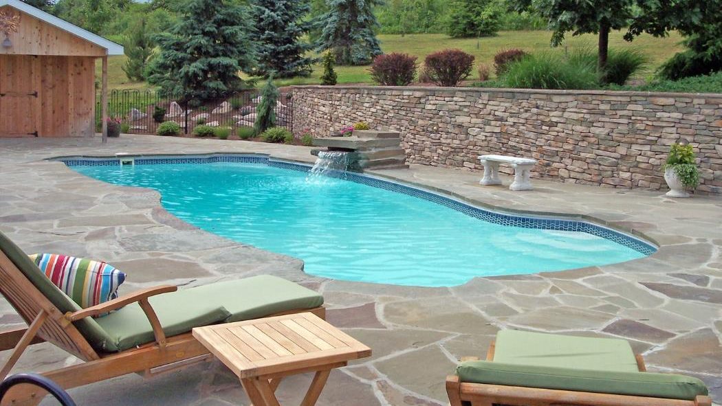 The Grand Cayman pool model. Dimensions: 14′ x 32′. Depth: 3′ to 6′. High-quality fiberglass pool perfect for your outdoor space.